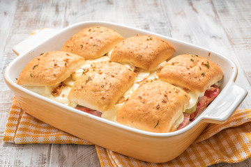 - Bake at 350 degrees for 20 min, or until cheese is melty and rolls have browned.