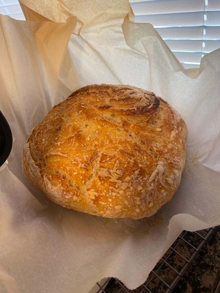 - Immediately remove bread from dutch oven by lifting the parchment paper out. Place on a cooling rack and cool 1 hour before cutting.