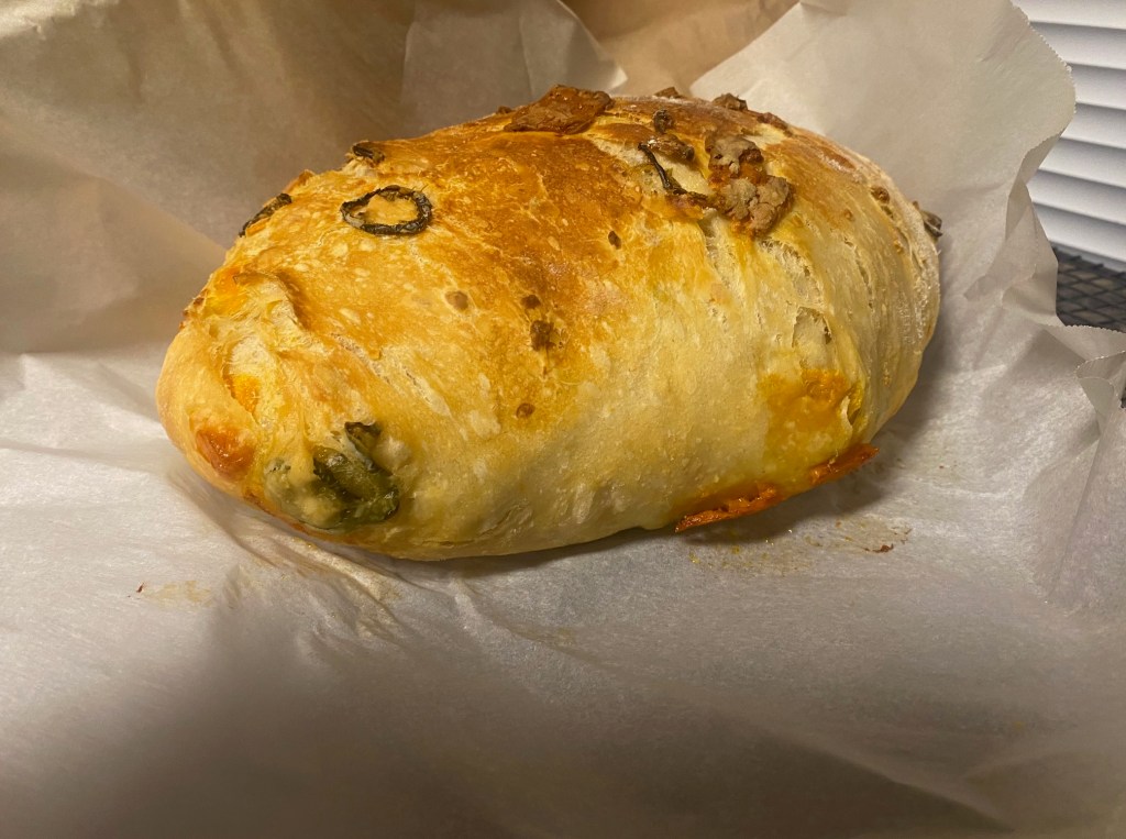 Generally, you want to use enough peppers and cheese that equals 20% of your dough’s total weight. So if your dough weighs 600g, you’ll use 60g peppers and 60g cheese to equal 120g. I ended up using two whole peppers and about 3/4 a block of cheese and it came out so flavorful and moist!